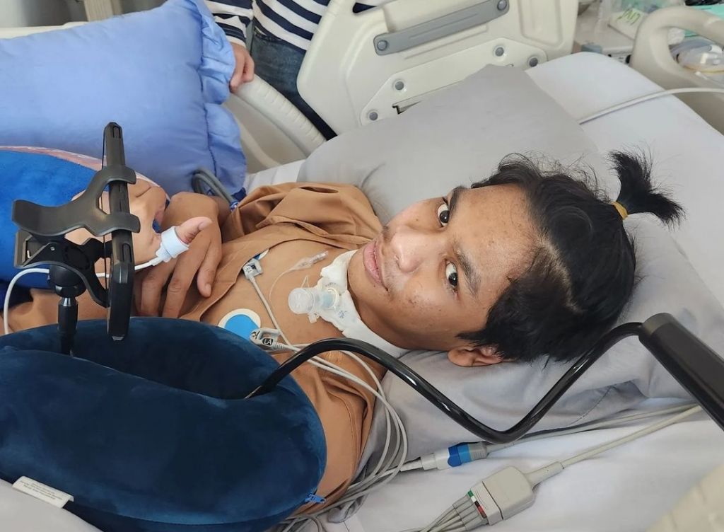Tampak David mulai bisa berbicara walaupun belum terdengar suaranya akibat lubang di tenggorokannya.