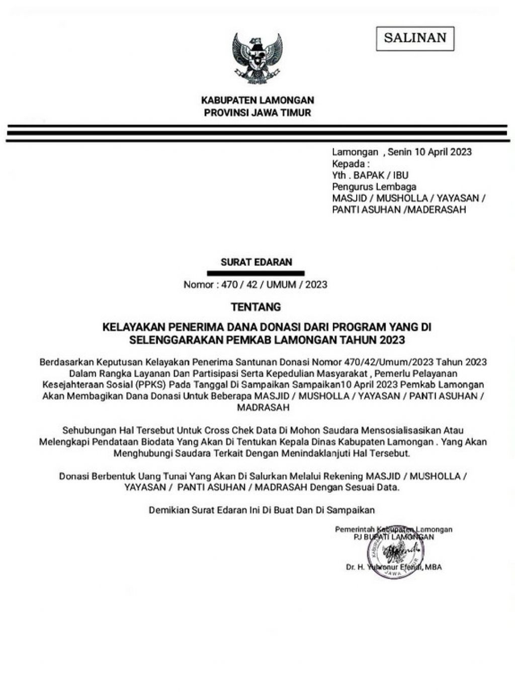 “Pemerintah Kabupaten Lamongan tidak pernah mengeluarkan surat edaran tentang kelayakan penerima dana donasi tahun 2023. Oeh karena itu warga masyarakat harus waspada terhadap akun yang mengaku sebagai pimpinan atau pejabat di lingkungan Pemerintah Kabupaten Lamongan,” terangnya di Kantor Diskominfo Lamongan, Rabu (12/04/2023).