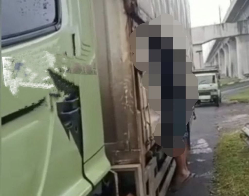 Korban ditemukan menggantung lantaran bagian kepala dan tangan korban terhimpit oleh wingbox truck kontainer tersebut.