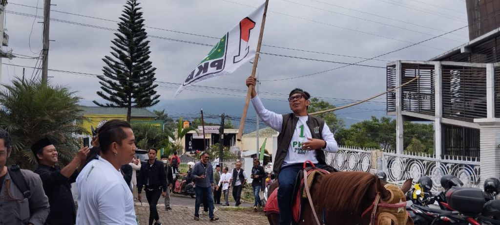 Sementara itu Ketua Partai Kebangkitan Bangsa Kota Batu, Nurochman menunggangi kuda sambil membawa bendera PKB layaknya seorang kesatria pulang dari medan perang dengan diiringi puluhan delman hias yang berisi Bacaleg PKB yang mau mendaftar memasuki area Kantor KPU Kota. Batu. Jalan Sultan Agung Kota Batu, Sabtu (13/5/2023).