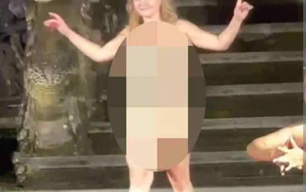Namun, perempuan berusia 28 tahun itu kembali datang tanpa sehelai kain pada tubuhnya. Dia berjalan santai naik panggung telanjang bulat saat sejumlah penari sedang pentas. Ia juga sempat merusak pintu masuk pementasan. Sementara itu, penonton lainnya yang kebanyakan wisatawan asing tak bisa berbuat banyak.ik