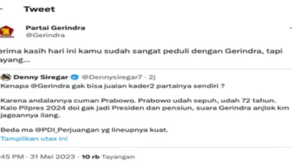 Dikutip dari cuitan akun Twitter @Dennysiregar7 pada Rabu, 31 Mei 2023, Denny dengan tiba-tiba menyenggol Prabowo dan Partai Gerindra.
