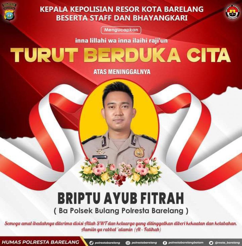 Seorang polisi anggota Polresta Barelang, Batam, Briptu Ayub Fitrah meninggal dunia setelah motor yang dikendarai ditabrak truk tangki. Briptu Ayub terlibat kecelakaan di Jalan Letjen Suprapto, depan SP Plaza, Kawasan Tembesi, Sagulung, Kota Batam, pagi tadi.