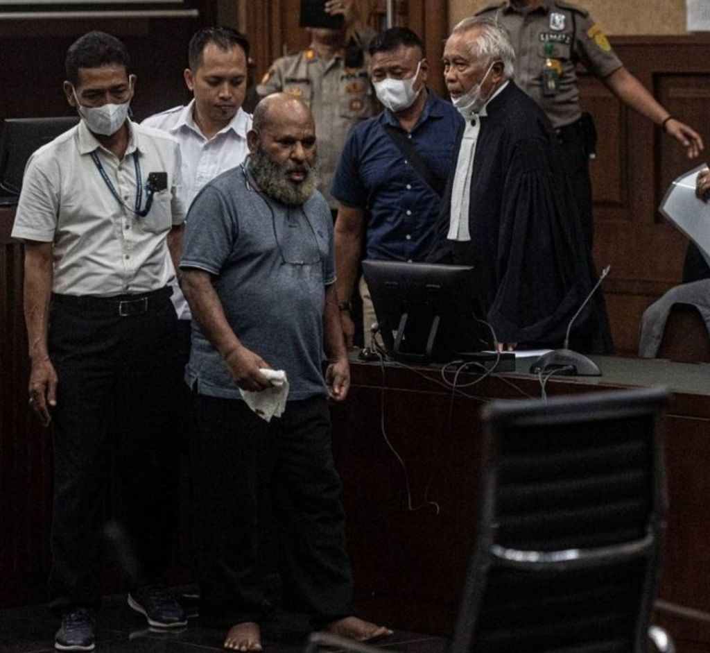 "Keberatan pribadi Lukas Enembe, saya difitnah, saya dizalimi, saya dimiskinkan," kata Petrus Bala saat membacakan keberatan Lukas Enembe.