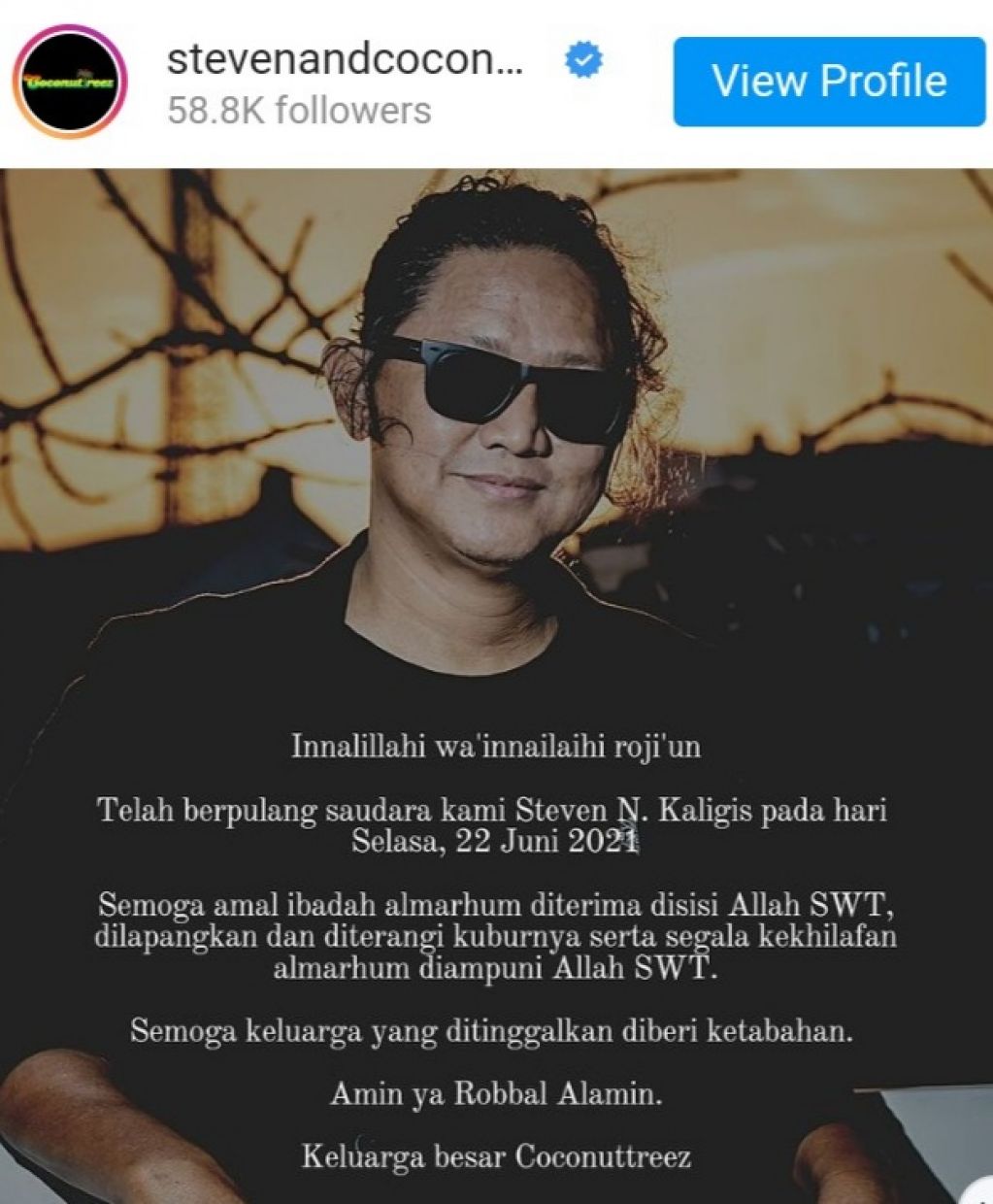 "Innalillahi wa'innailaihi roji'un. Telah berpulang saudara kami Steven N. Kaligis (Tepeng) pada hari Selasa, 22 Juni 2021 pukul 07.30 WIB," tulis Steven & Coconuttreez di kolom caption.