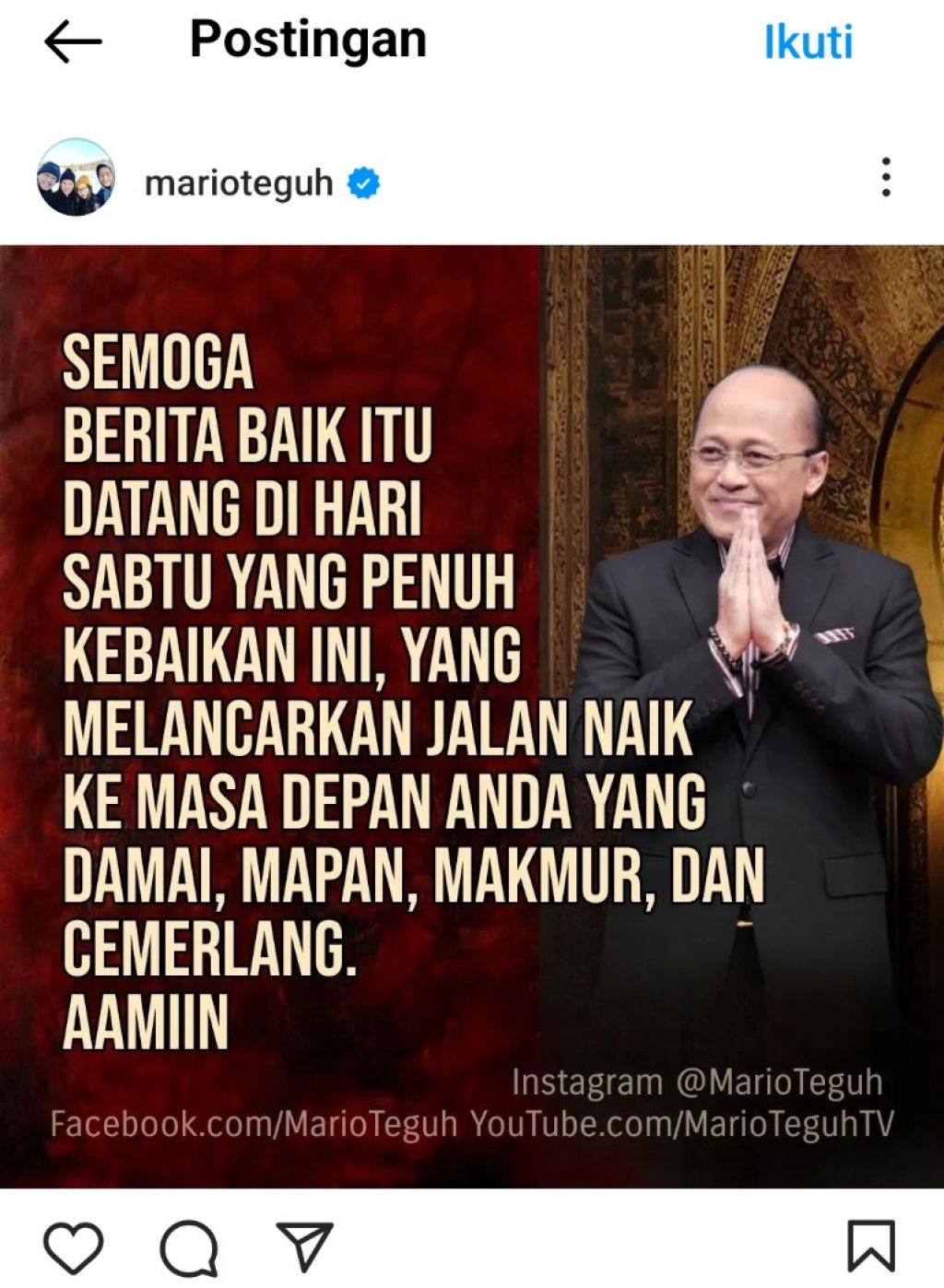 "Semoga anda sukses di hari Jumat yang indah ini, tuntas mengatasi masalah, dan lancar meningkatkan derajat kehidupan anda. Aamiin." bunyi motivasi Mario Teguh di Instagram.