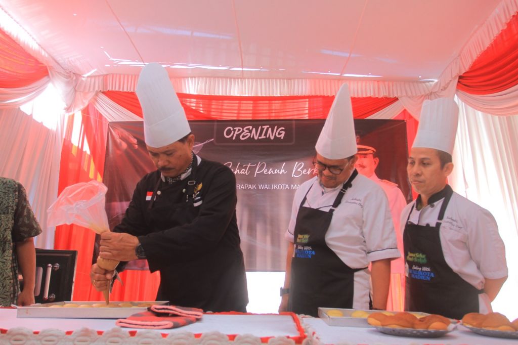 Ya, dia memamerkan keterampilan membuat kue. Mulai mengaduk adonan, menghias dan memasukkan adonan roti ke dalam oven. Cara ini diikuti juga oleh Direktur RSUD Kota Madiun dr. Muhammad Nur dan Sekda Kota Madiun Soeko Dwi Handiarto. Setelah jadi, roti tersebut langsung dibagikan ke pasien serta pengunjung rumah sakit.