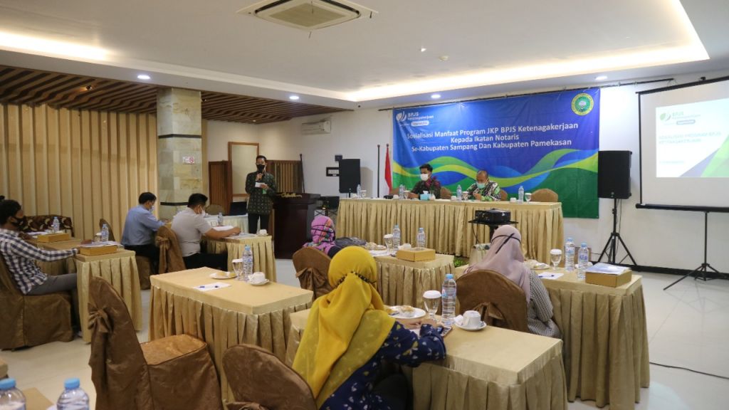 PAMEKASAN (Realita) - Badan Penyelenggara Jaminan Sosial (BPJS) Ketenagakerjaan Cabang Madura Pamekasan mensosialisasikan program dan manfaat BPJS Ketenagakerjaan pada para Notaris dan Pejabat Pembuat Akta Tanah (PPAT) Sampang dan Pamekasan, Rabu (23/6/2021).