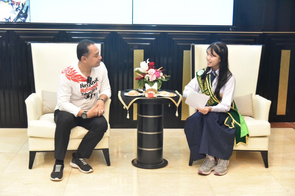 SURABAYA (Realita)- Reporter cilik atau reporter anak dari Tunas Hijau diberikan kesempatan untuk mewawancarai langsung Wali Kota Surabaya Eri Cahyadi di ruang kerjanya, Senin (31/7/2023). Reporter anak itu bernama Queen Anneysa Kabeer Lukito yang saat ini masih duduk di bangku kelas VII SMPN 1 Surabaya. Ia juga runner up putri lingkungan hidup 2022 sekaligus Duta Eco Student of the Year 2022.