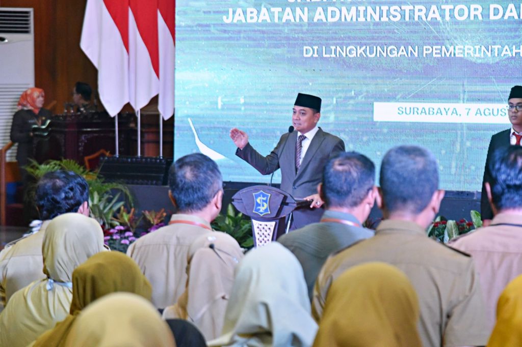 SURABAYA (Realita)- Wali Kota Surabaya Eri Cahyadi kembali melakukan rotasi dan mutasi pejabat Pemerintah Kota (Pemkot) Surabaya di Graha Sawunggaling, Senin (7/8/2023). Pelantikan dan Pengangkatan jabatan Pimpinan Tinggi Pratama, jabatan administrator dan jabatan pengawas itu dilakukan untuk menggenjot dan memberikan semangat baru kerja tim di lingkungan Pemkot Surabaya.