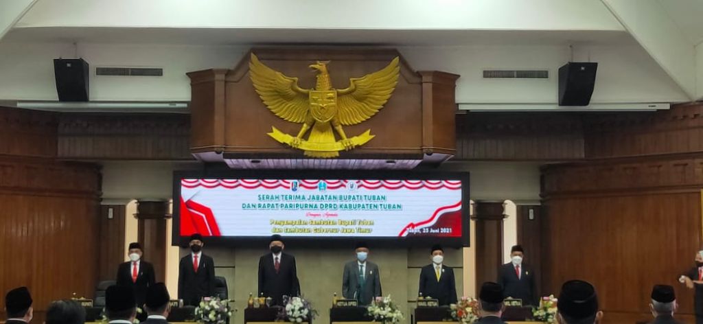 TUBAN (Realita) - Dewan Perwakilan Rakyat (DPRD) Kabupaten Tuban menggelar serah terima jabatan (Sertijab) Bupati dan Wakil Bupati Tuban terpilih Aditya Halindra Faridzky - Riyadi, di gedung DPRD Kabupaten Tuban, Jumat (24/6/21).