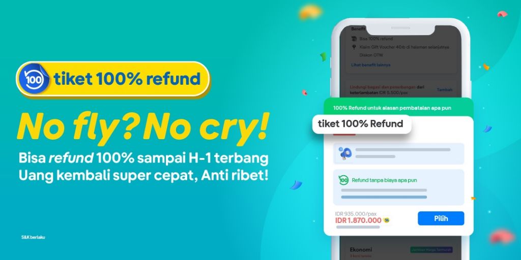 Sobat tiket bisa mendapatkan refund 100�lam bentuk limit kartu kredit, Blipay, maupun Paylater dengan cepat dan tentunya bisa menjadi solusi ketika liburan tidak berjalan sesuai rencana. Dengan proses klaim-nya yang mudah, sekarang beli tiket pesawat jadi less worry, no fly no cry! Informasi lebih lanjut dapat diakses pada tautan berikut https://www.tiket.com/info/tiket-100-persen-refund.