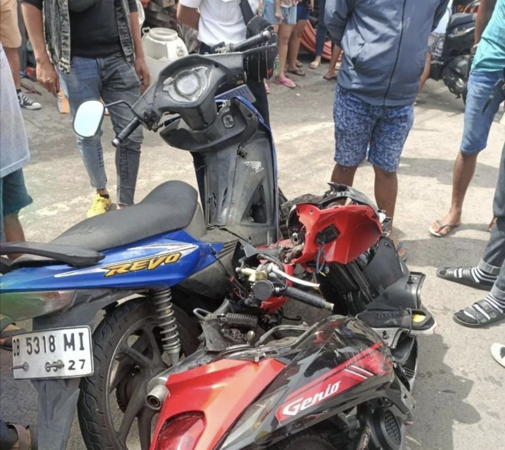 Kendaraan yang terlibat kecelakaan adalah motor Honda Revo berwarna biru bernomor polisi DB 5318 MI dan juga motor Honda Genio warna merah yang tak diketahui pelat nomornya.