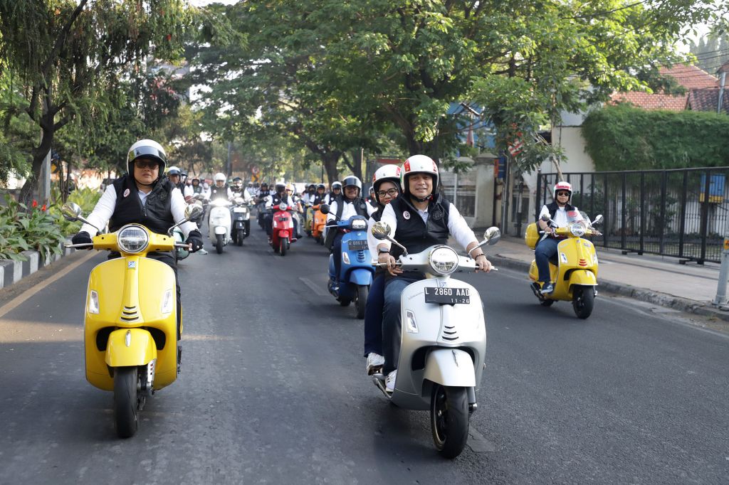 SURABAYA (Realita)- Pemerintah Kota (Pemkot) Surabaya bersama Bank Jatim menggelar sunday morning ride (Sunmori) bersama ratusan peserta dari komunitas Vespa di Balai Kota, Minggu (20/8/2023). Sunmori ini digelar dalam rangka memperingati Hari Ulang Tahun (HUT) ke-62 Bank Jatim.