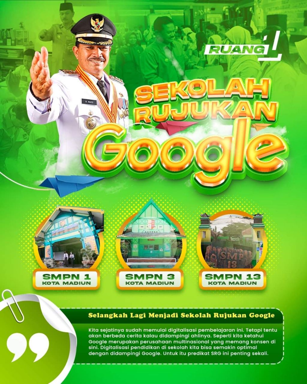 SELANGKAH lagi, sekolah di kota kita akan berpredikat Sekolah Rujukan Google (SRG). Setidaknya ada tiga sekolah yang kita usulkan di awal ini. Yakni, SMPN 1, SMPN 3, dan SMPN 13 Kota Madiun. Belum banyak sekolah di negeri ini yang menyandang predikat SRG. Sejauh ini baru tercatat ada lima sekolah. Itu pun sekolah swasta. Kalau ini terwujud, tiga sekolah kita tadi menjadi sekolah negeri pertama di tanah air yang menyandang predikat SRG tersebut. Mengapa tiga sekolah itu dulu? ya, karena ketiganya memang saya siapkan sebagai sekolah terintegrasi di Kota Madiun.