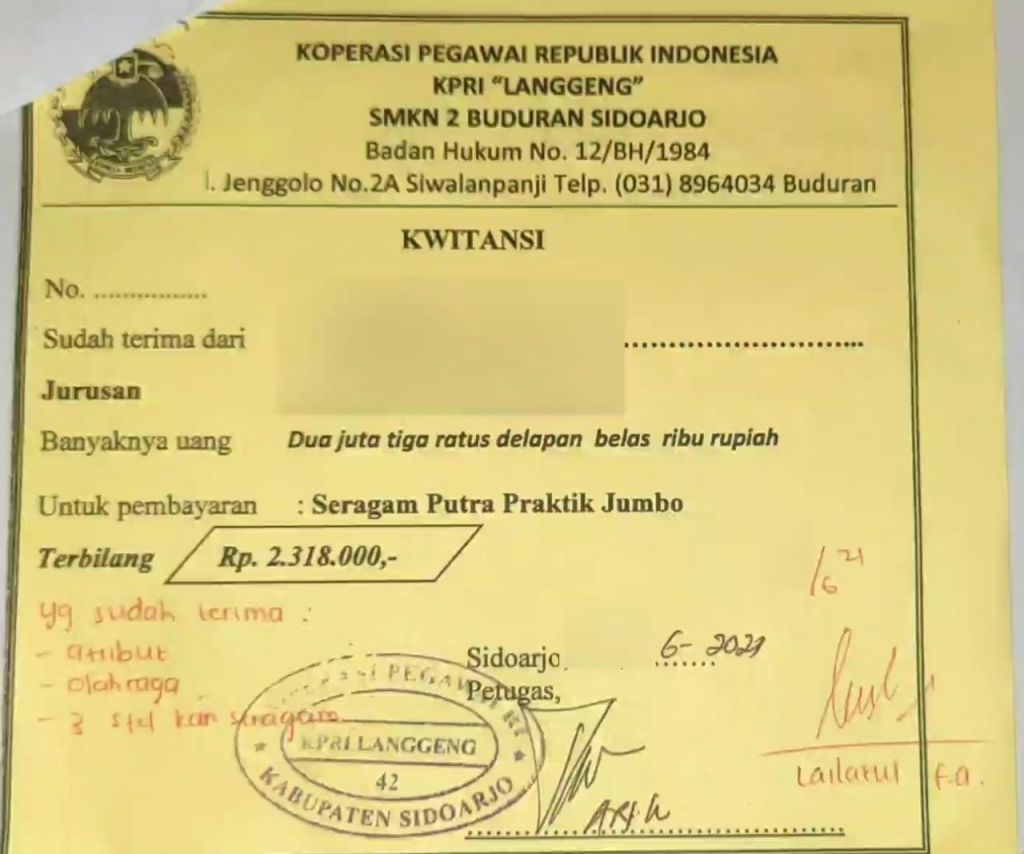 Dari penelusuran Realita.co di salah satu sekolah di Sidoarjo, harga kain seragam SMA/SMK beserta atributnya bisa mencapai Rp 2,5 juta untuk siswa, dan Rp 2,8 juta untuk siswi. Sementara ini, Kasi SMA/SMK dan PKLK Cabdin Wilayah Sidoarjo Evi Dwi Wijayanti memilih tidak memberikan komentar saat dimintai keterangan Realita co.