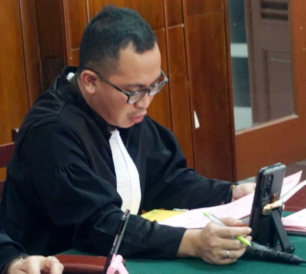 Jaksa Herlambang Adhi Nugroho dari Kejari Tanjung Perak Surabaya, Membacakan dakwaan terhadap Selebgram Rahmawati binti Munanggi, diruang Tirta 1 PN Surabaya secara video call.ys