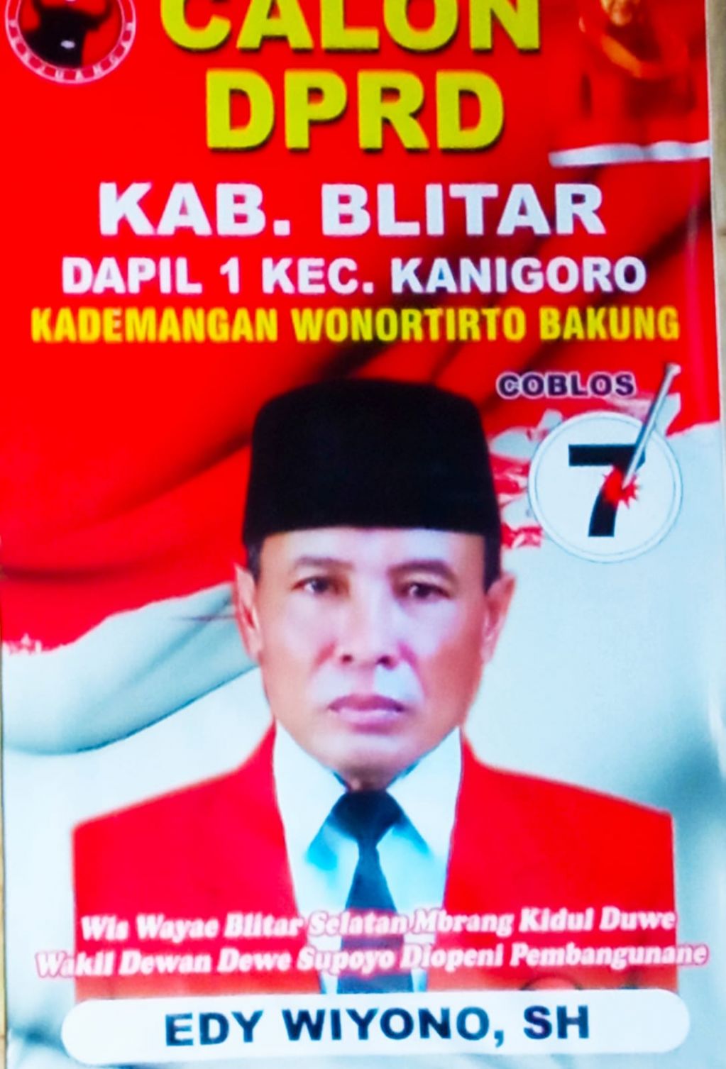 Satu diantara kandidat Calon Anggota Legislatif yang bakal ikut kontestan dalam pemilu 2024 mendatang adalah Edy Wiyono, SH atau biasa sapaan akrabnya Mas Edy yang diusung dari Partai Demokrasi Indonesia Perjuangan(PDI-P) PAC kecamatan Kademangan Kabupatèn Blitar Jawa Timur.