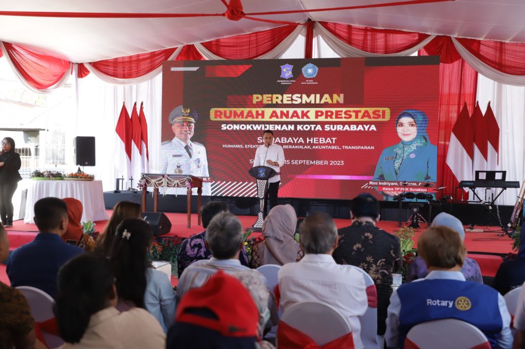 SURABAYA (Realita)- Pemerintah Kota (Pemkot) Surabaya meresmikan Rumah Anak Prestasi (RAP) Sonokwijenan di Jalan Sono Indah VII No 10, Kecamatan Sukomanunggal, Surabaya, Jumat (15/9/2023). Rumah Anak Prestasi tersebut, merupakan pengembangan dari RAP yang sudah berdiri sebelumnya di Nginden Semolo, Sukolilo Surabaya.