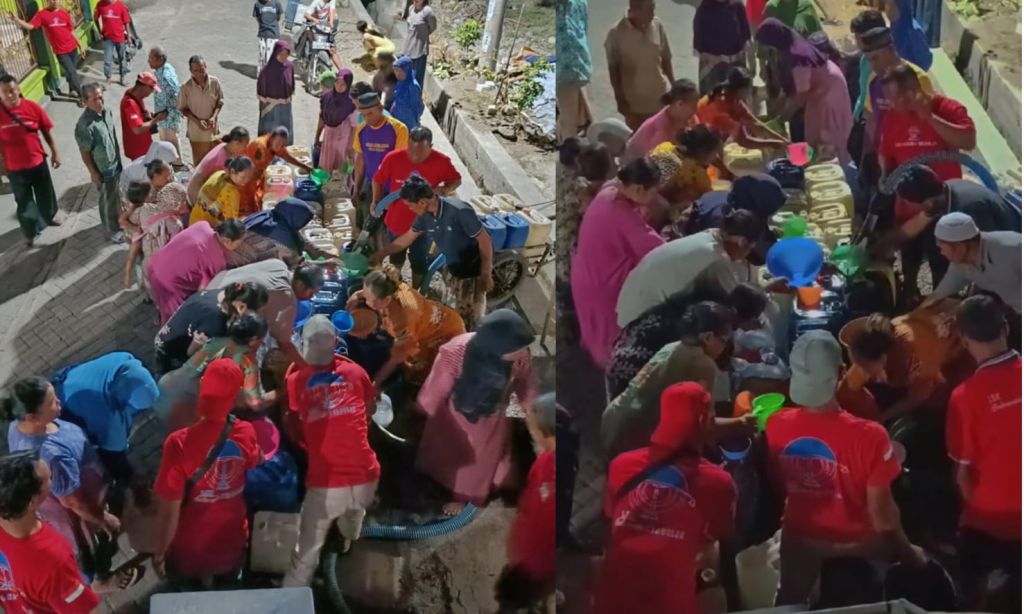 Dengan mengirim 4 truk tangki air yang masing-masing berisi 5000 liter, warga nampak berebut dengan membawa jirigen dan peralatan lainnya. Def