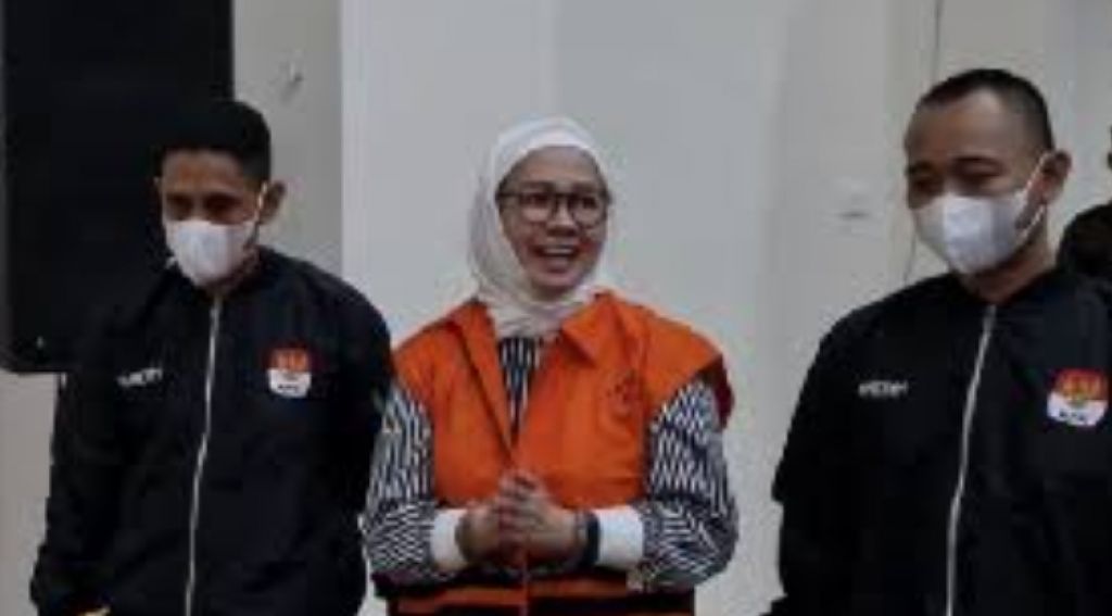Hadir dalam pengumuman tersebut, Karen mengenakan rompi tersangka KPK berwarna oranye dengan kerudung putih.