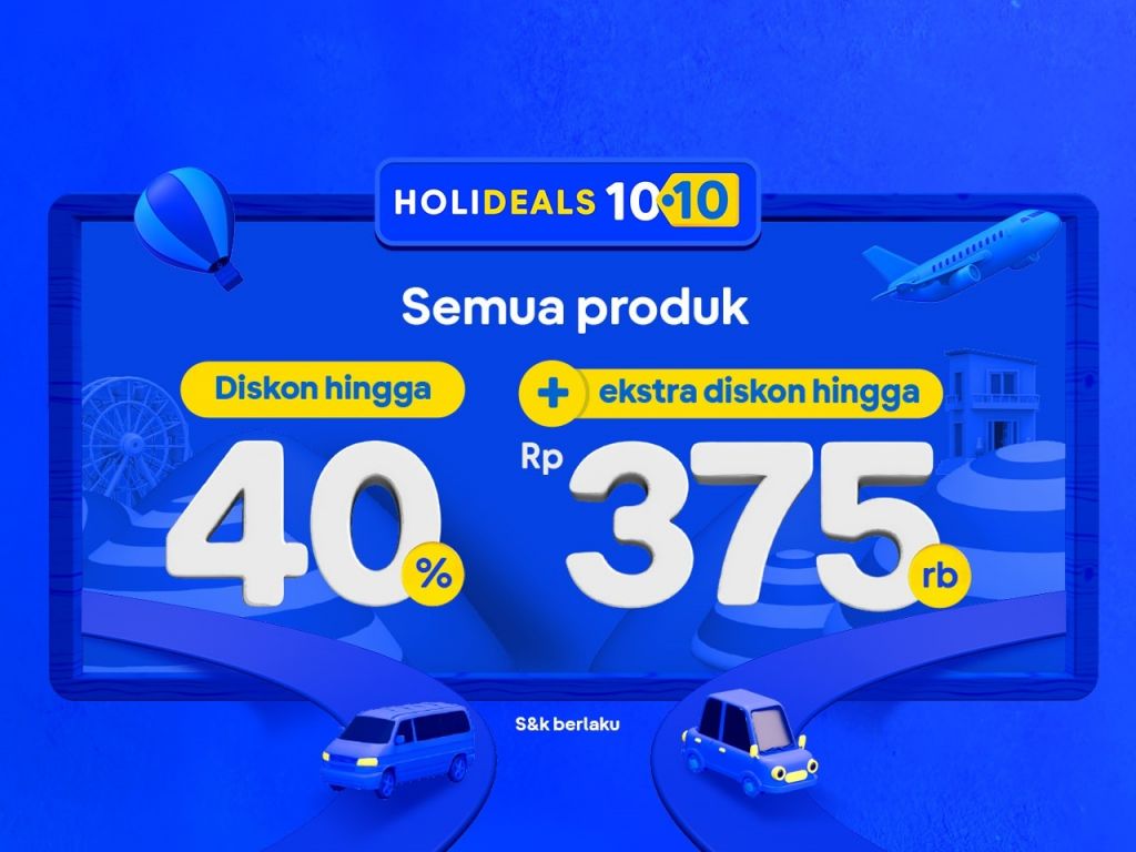 Tak hanya itu, 10.10 HOLIDEALS juga menyediakan diskon hingga 40�ngan potongan harga tambahan hingga Rp375 ribu yang dapat digunakan untuk seluruh produk dalam aplikasi tiket.com. Dapatkan juga diskon hingga Rp180 ribu untuk penerbangan domestik dengan kode promo HOLIDEALSTIKET dan diskon hingga Rp400 ribu dengan HOLIDEALSFLIGHT untuk penerbangan internasional ke berbagai destinasi pilihan. Jangan lewatkan diskon 40�ngan potongan harga tambahan hingga Rp375 ribu untuk hotel domestik dengan kode promo HOLIDEALSHOTELDOM dan villa dengan kode promo HOLIDEALSSTAY, serta diskon 50�ngan potongan harga tambahan hingga Rp375 ribu untuk akomodasi internasional dengan kode HOLIDEALSSTAYINT.