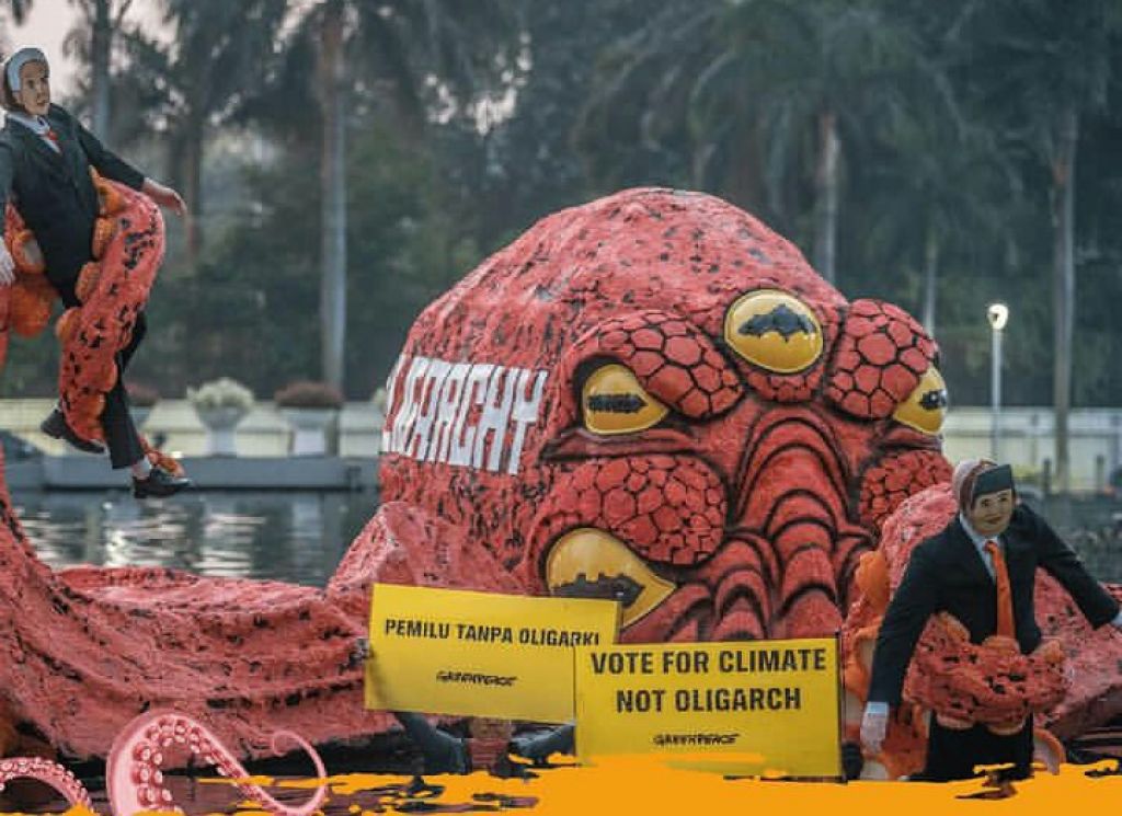 Dalam keterangannya kepada wartawan, Kombes Pol. Komarudin selaku Kapolres Metro Jakarta Pusat mengatakan, para aktivis membawa atribut berupa ornamen gurita raksasa yang bertuliskan oligarki yang kemudian dimasukkan ke dalam kolam Bundaran HI.