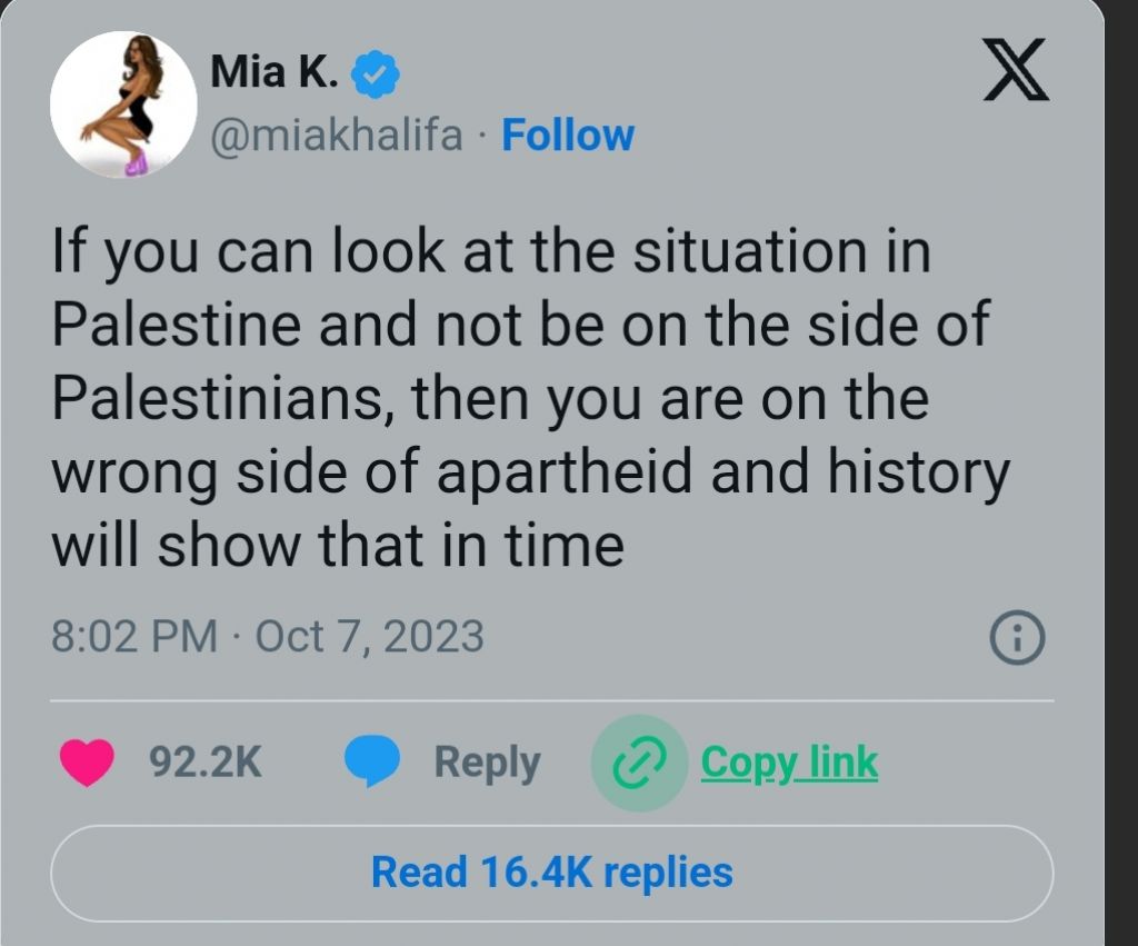 Sejak serangan Hamas beberapa hari lalu, Mia Khalifa sangat vokal untuk memberi dukungan pada Palestina pada akun X miliknya, @miakhalifa. Cuitan ini ia bagikan kepada 5,6 juta pengikutnya.
