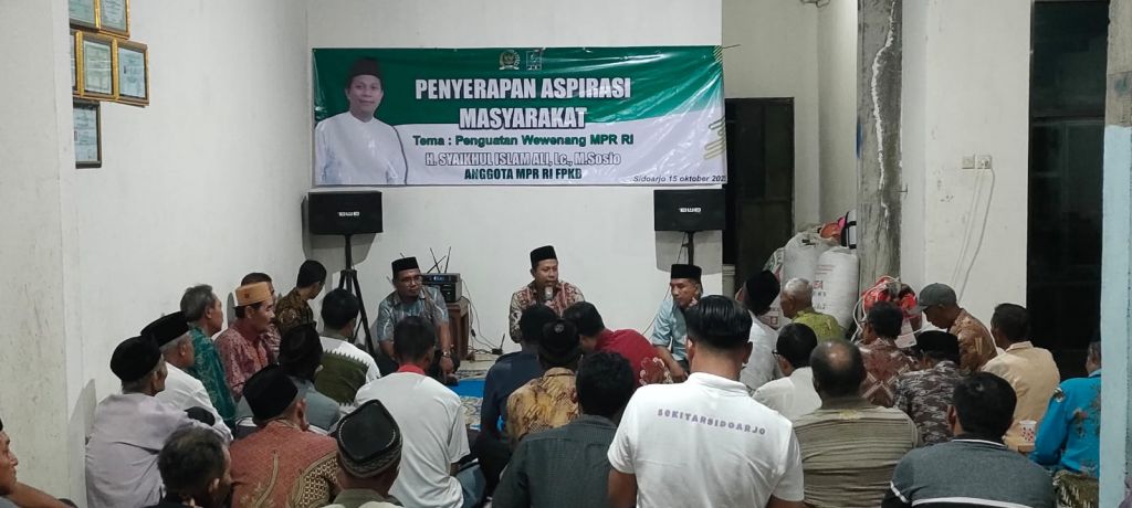 SIDOARJO (Realita)- Komisi VII DPR-RI dari F-PKB, H. Syaikhul Islam Ali, gelar ngobrol bareng bersama warga, di kediaman ketua Gabungan Kelompok Tani (Gapoktan) Irfan, Desa Singkalan, Kecamatan Balongbendo, Kabupaten Sidoarjo, Jawa Timur, Selasa (17/10/2023).