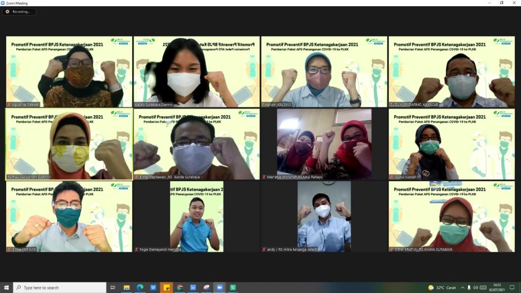Bantuan tersebut diserahkan secara langsung oleh Kepala Kantor Cabang BPJAMSOSTEK Surabaya Darmo, Guguk Heru Triyoko, kepada 4 perwakilan mitra PLKK. Kegiatan ini juga dihadiri para undangan melalui zoom atau secara virtual sesuai protokol pencegahan penularan Corona Virus Disease 2019 (Covid-19).