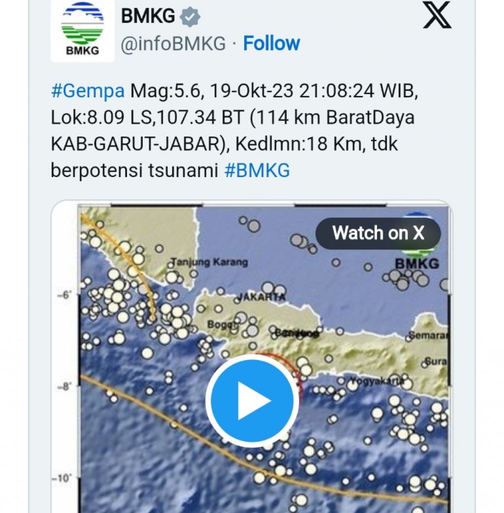 JAKARTA- Gempa berkekuatan 5,6 magnitudo mengguncang Kabupaten Garut, Jawa Barat. melaporkan gempa terjadi pada Kamis (19/10) pukul 21.08 WIB.