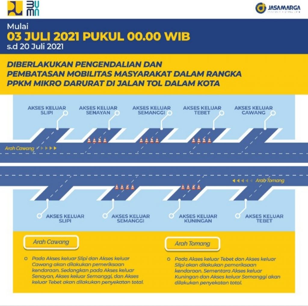 JAKARTA- Sehubungan dengan adanya pembatasan dan pengendalian mobilitas masyarakat selama Pemberlakuan Pembatasan Kegiatan Masyarakat (PPKM) darurat, atas diskresi dan berkoordinasi dengan Satuan Polisi Jalan Raya (PJR), Jasamarga Metropolitan Tollroad selaku pengelola Jalan Tol Dalam Kota (Cawang – Tomang – Pluit) mendukung pelaksanaan pembatasan tersebut dengan melakukan pengaturan lalulintas di beberapa lokasi akses keluar di Jalan Tol Dalam Kota.