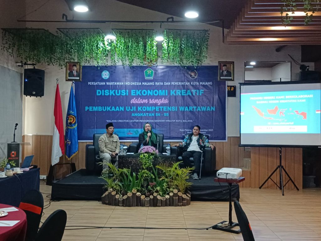 KOTA MALANG (Realita)- Diskusi ekonomi kreatif dengan tema 'MCC Sebagai Masa Depan Ekonomi Kreatif Kota Malang' menjadi sesi pembukaan Uji Kompetensi Wartawan (UKW) PWI Malang Raya angakatan 54 dan 55 yang digelar di salah satu hotel di Kota Malang, Jumat (17/11/2023) pagi.