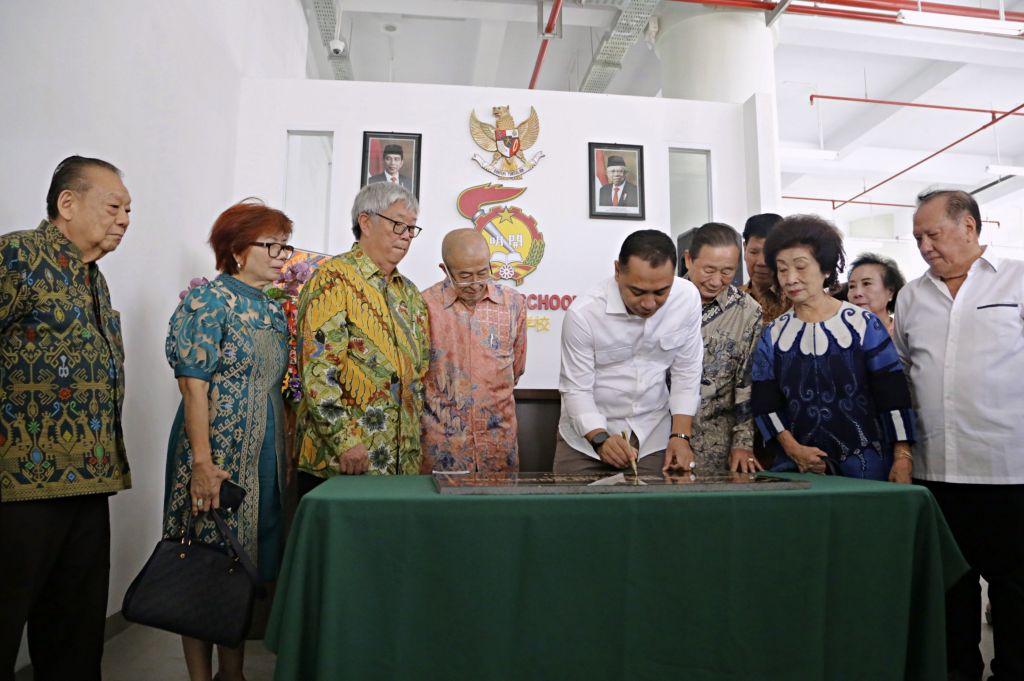 SURABAYA (Realita)- Wali Kota Surabaya Eri Cahyadi meresmikan gedung baru sekolah Khay Ming yang merupakan sekolah internasional dengan tiga bahasa, Rabu (22/11/2023). Peresmian gedung baru itu ditandai dengan penandatanganan prasasti oleh Wali Kota Eri. Bahkan, saat itu Wali Kota Eri juga sempat meninjau sejumlah ruangan dan kelas di gedung baru itu.