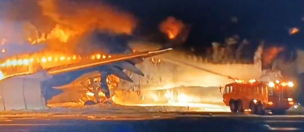 Menurut tayangan NHK, api terlihat muncul dari dekat area mesin pesawat dan para petugas pemadam kebakaran bergegas berusaha memadamkan api. Hingga pukul 18.30 waktu setempat, pesawat penumpang itu hampir seluruhnya dilalap api.