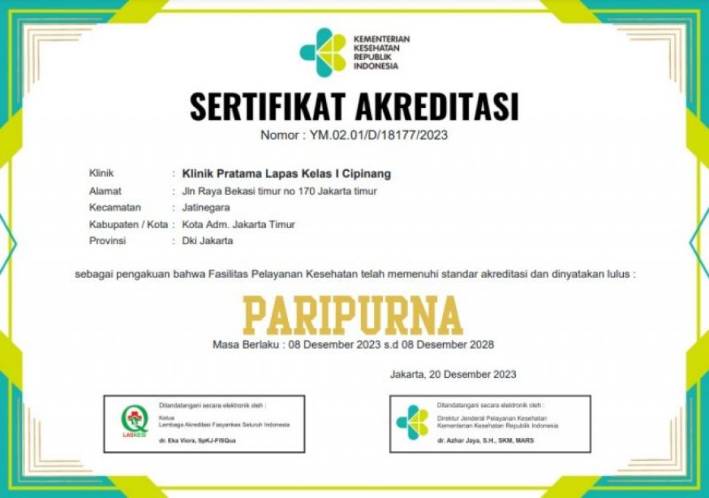 JAKARTA (Realita)-Usai melaksanakan serangkaian penilaian akreditasi pada Desember 2023 tahun lalu, berdasarkan sertifikat Kementerian Kesehatan Republik Indonesia Nomor : YM.02.01/D/18177/2023 menyatakan Klinik Pratama Lapas Kelas I Cipinang berhasil diakui memiliki fasilitas pelayanan kesehatan yang memenuhi standar akreditasi sehingga dinyatakan sebagai klinik dengan tingkat Paripurna.
