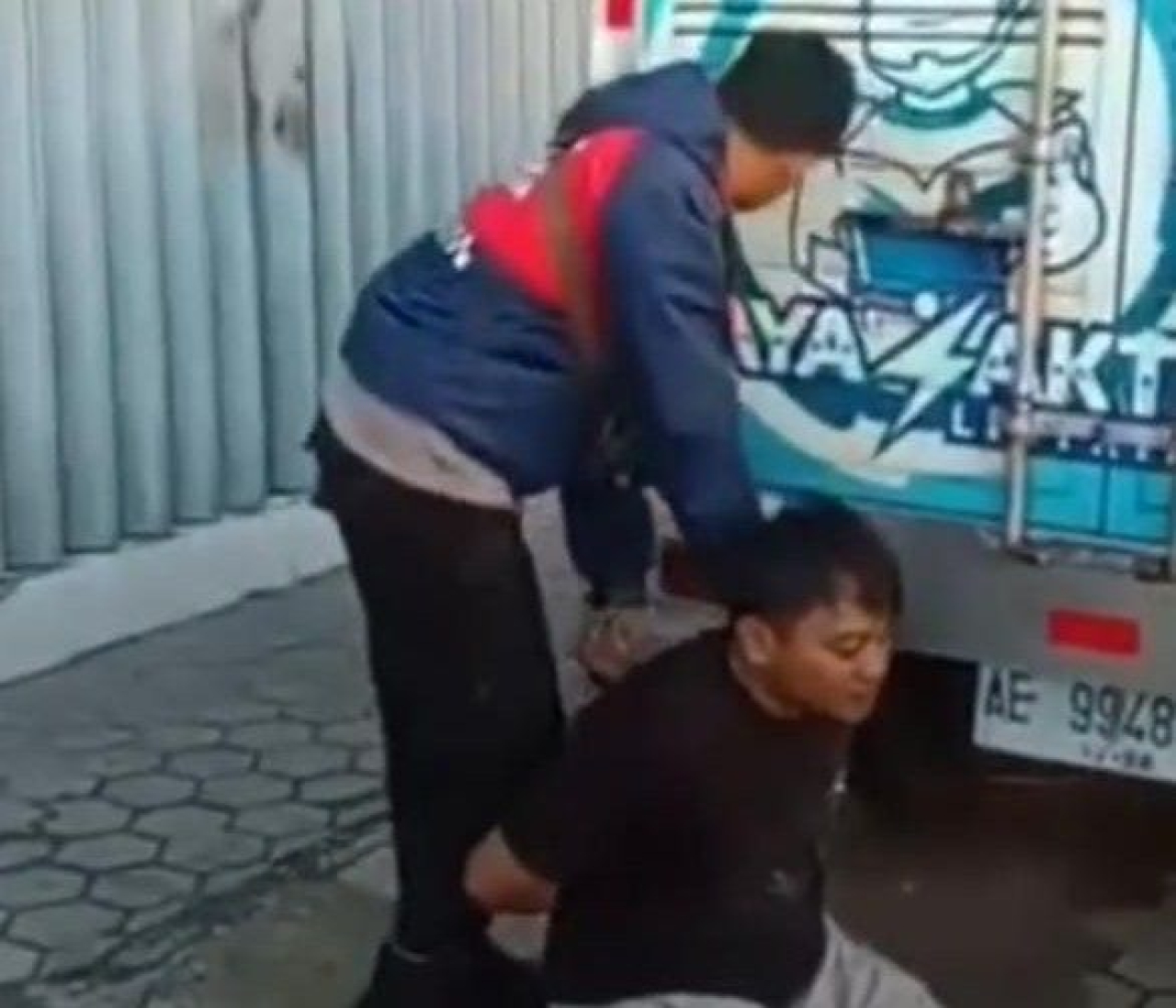 Warga sekitar yang emosi melihat pelaku menabrak polisi lantas menghentikan motor pelaku, dan menghujani pelaku dengan bogem mentah hingga babak belur.