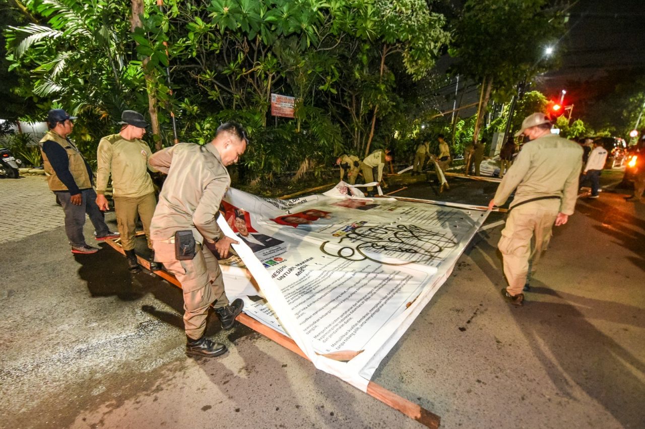 SURABAYA (Realita)- Pemerintah Kota (Pemkot) Surabaya melalui Satpol PP Kota Surabaya terus menyisir seluruh wilayah guna menertibkan Alat Peraga Kampanye (APK) di saat masa tenang Pemilihan Umum (Pemilu) 2024. Dari hasil penyisiran yang dilakukan sejak Minggu (11/2/2024) dini hari hingga Senin (12/2/2024), Satpol PP Surabaya berhasil menertibkan dan mengangkut APK menggunakan 35 dump truk.