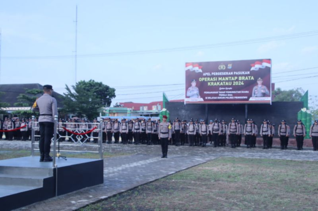 PRINGSEWU - Polres Pringsewu menggelar apel pergeseran pasukan untuk pengamanan Tempat Pemungutan Suara (TPS) dalam Pemilihan Umum 2024.