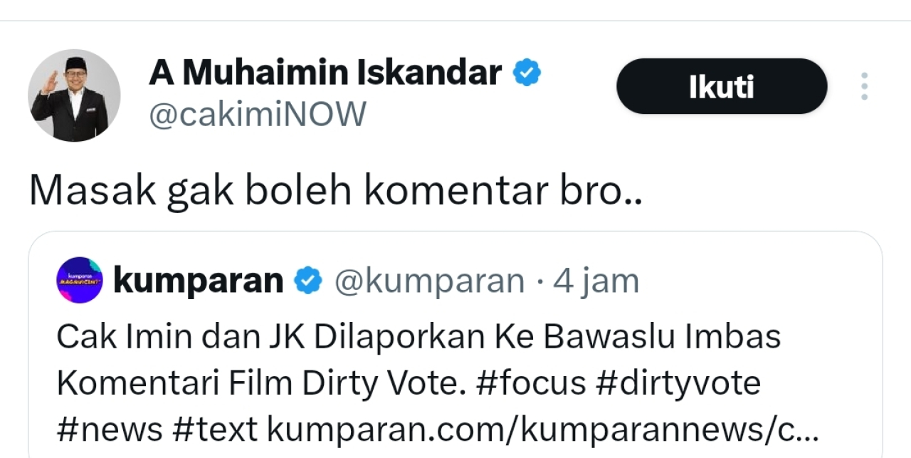 Komentar Cak Imin yang dimaksud Advokat Lisan ini adalah cuitan Cak Imin di X yang juga mengunggah potongan film Dirty Vote dengan keterangan “Ada yang sudah nonton?”.