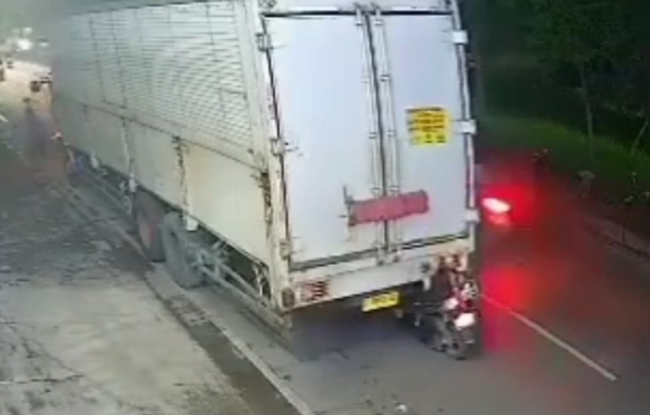 Diduga karena mengantuk seorang pemotor menabrak bagian belakang truk wingbok yang tengah berhenti di pinggir jalan