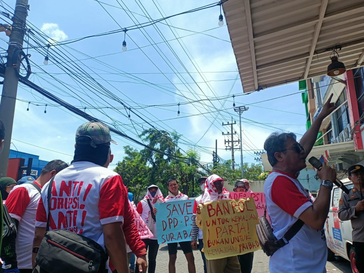 Massa kader PSI mendatangi kantor DPD dengan berjalan kaki sambil membentangkan karton berisi tuntutan dan seruan agar kader PSI wajib menjaga marwah partai serta mengajak menurunkan koruptor.