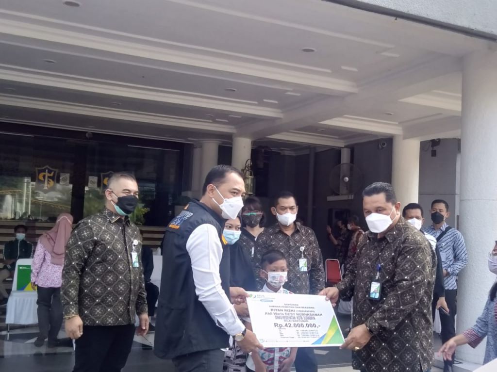 Sedangan santunan JKM diserahkan kepada ahli waris 8 peserta BPJAMSOSTEK yang telah meninggal dunia, yang masing-masing mendapatkan Rp 42 juta.