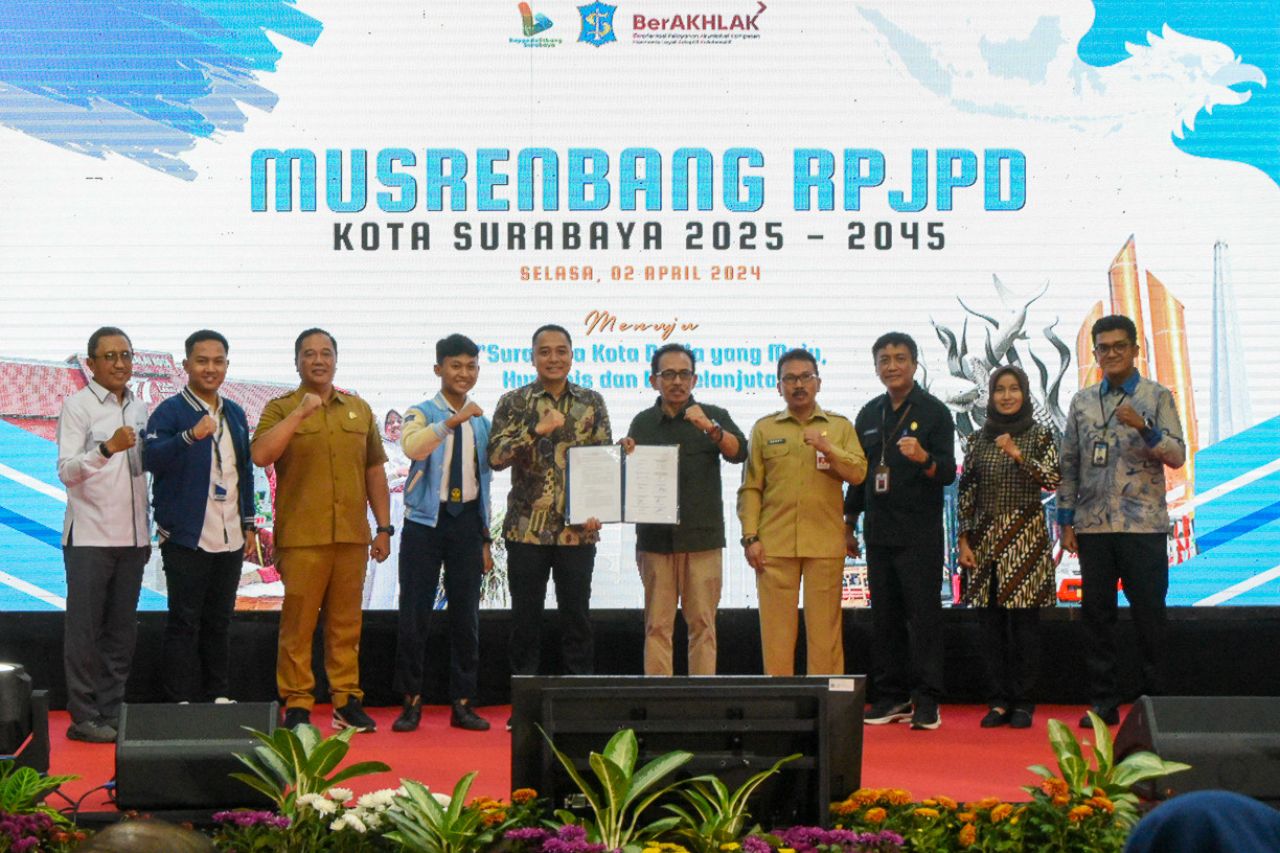 SURABAYA (Realita)- Wali Kota Surabaya Eri Cahyadi membuka langsung forum Musyawarah Rencana Pembangunan (Musrenbang) dalam rangka penyusunan Rencana Pembangunan Jangka Panjang Daerah (RPJPD) Kota Surabaya tahun 2025-2045, di Graha Sawunggaling Kantor Pemerintah Kota (Pemkot) Surabaya, Selasa (2/4/2024). Musrenbang RPJPD menjadi titik penting dalam membangun pondasi pembangunan Kota Surabaya di dua puluh tahun ke depan.