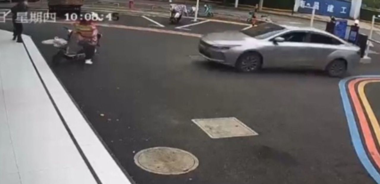 Di mana sebuah kendaraan mobil berwarna perak menabrak seorang pejalan kaki yang sedang menyeberang jalan di tikungan, dan kemudian menabrak seorang ibu dan anak perempuannya di depan sebuah supermarket.