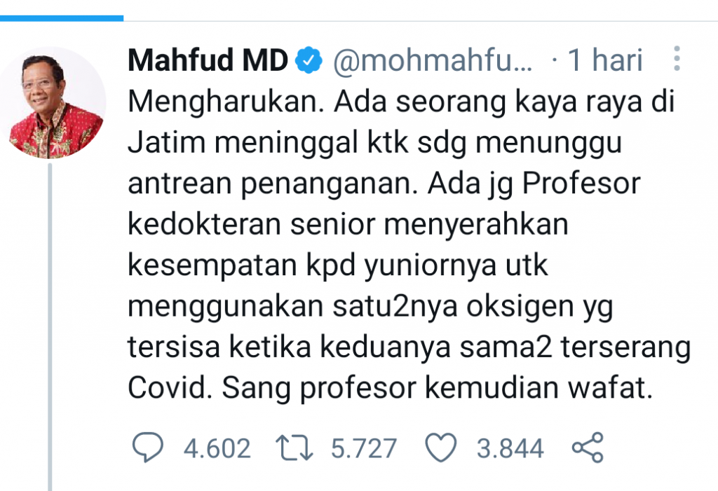 "Mengharukan. Ada seorang kaya raya di Jatim meninggal ktk sdg menunggu antrean penanganan. Ada juga profesor kedokteran senior menyerahkan kesempatan kpd yuniornya utk menggunakan satu2nya oksigen yg tersisa ketika keduanya sama2 terserang Covid. Sang profesor kemudian wafat," cuitnya @mohmahfudmd.