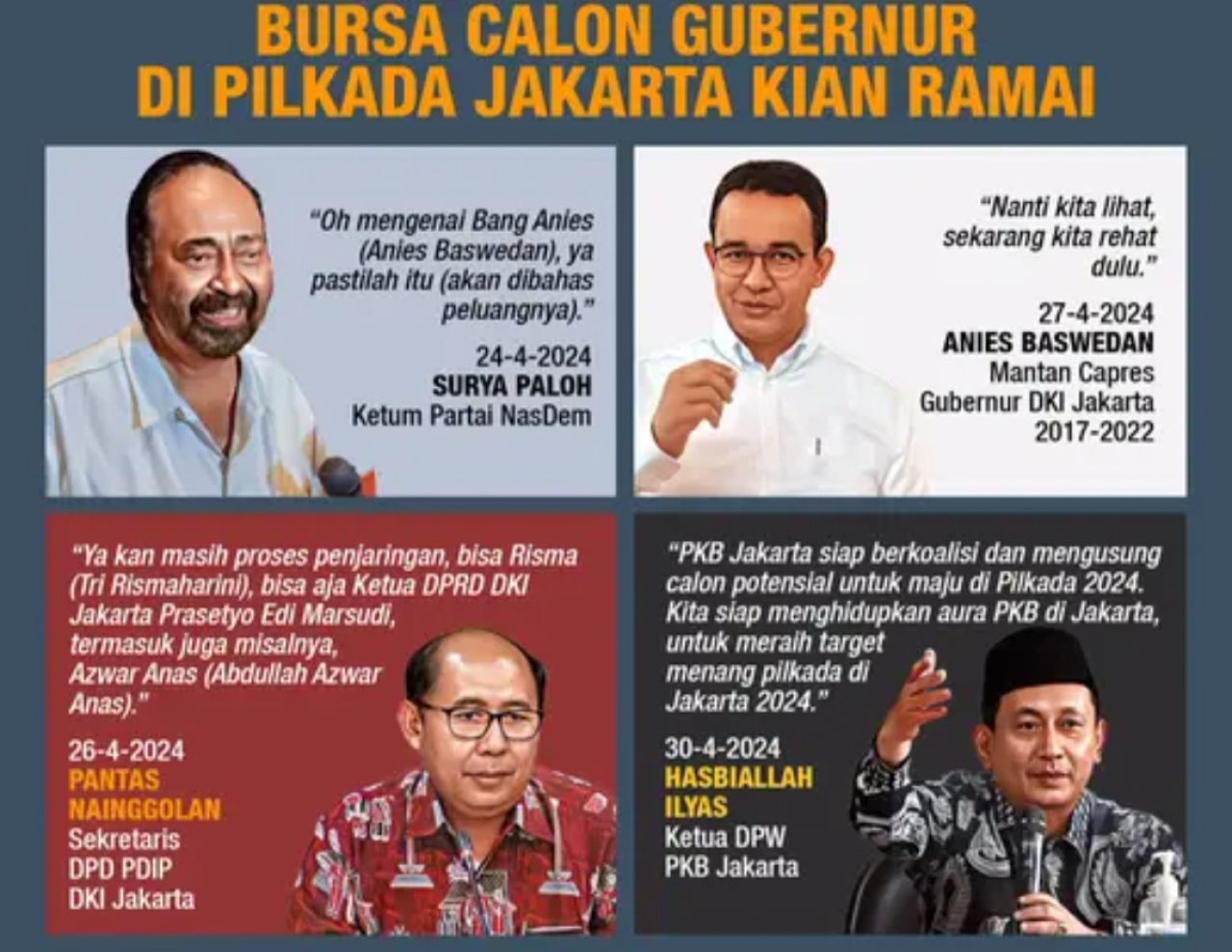 JAKARTA (Realita). Hajatan pilkada Jakarta masih delapan bulan lagi atau tepatnya November 2024. Namun, hawanya sudah mulai terasa hangat. Sejumlah nama mulai berseliweran di publik. Bukan orang biasa, melainkan sosok kesohor di dunia politik.