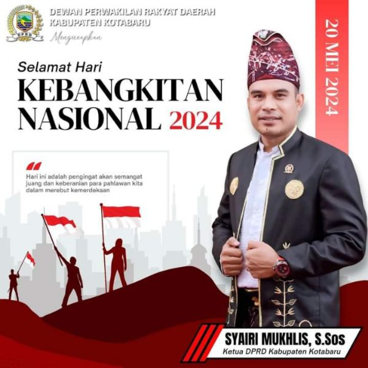 KOTABARU (Realita) - Ketua DPRD Kotabaru Syairi Mukhlis. S. Sos mengucapkan elamat hari Kebangkitan Nasional ke-116 tahun 2024, Senin (20/05/2024).