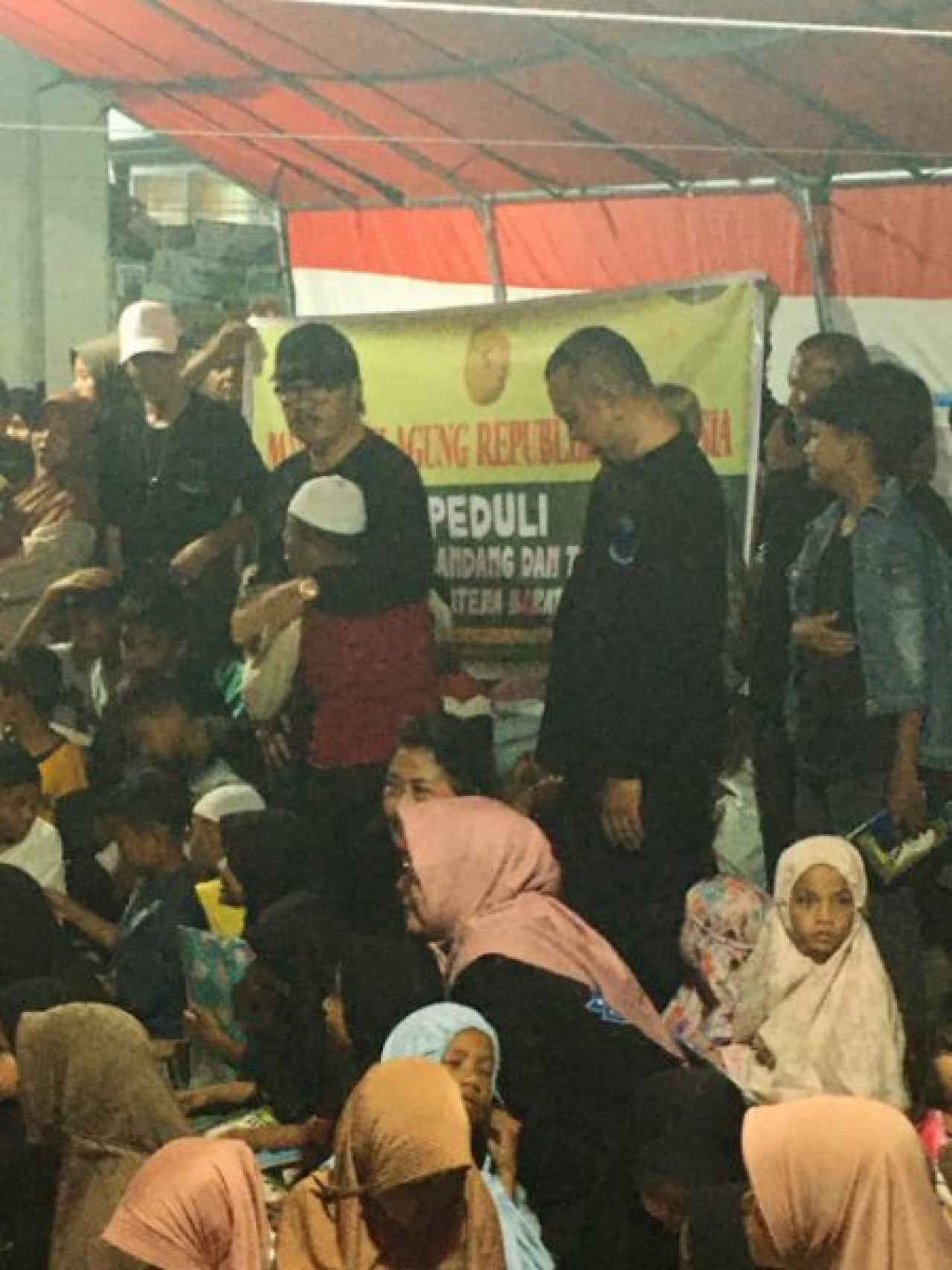 Saat membagikan perangkat alat solat ada momen mengharukan. Hakim Yulius terlihat memakaikan kopiah dan sarung kepada anak pengungsi. Bahkan Yulius memeluknya dengan erat.