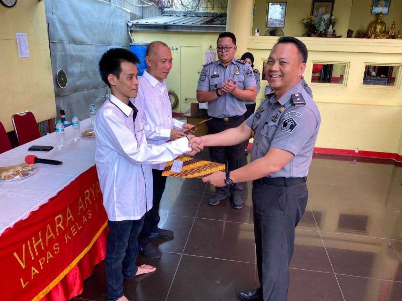 Lapas Kelas I Cipinang melaksanakan kegiatan pemberian remisi khusus keagamaan kepada narapidana yang memeluk agama Budha. Kegiatan penyerahan remisi tersebut dilaksanakan di Vihara Ariyasacca yang berlokasi didalam lingkungan lapas, pada Kamis, (23/5/2024).
